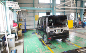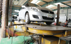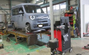 4輪トータルアライメント(脱輪してしまい走行性能に異常をきたしてしまった際に4輪の足回りの狂いを測定・調整します。)